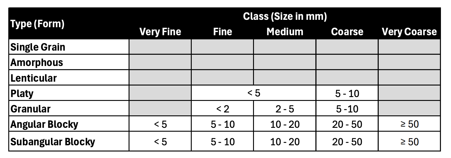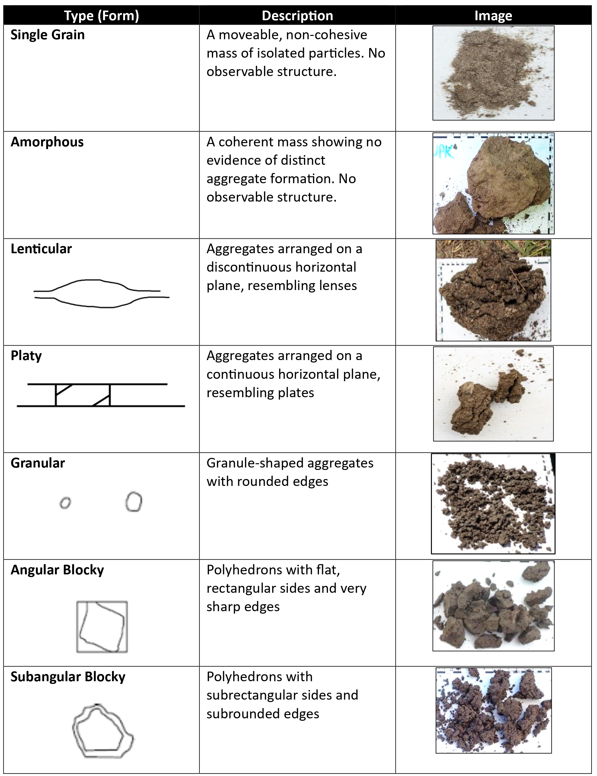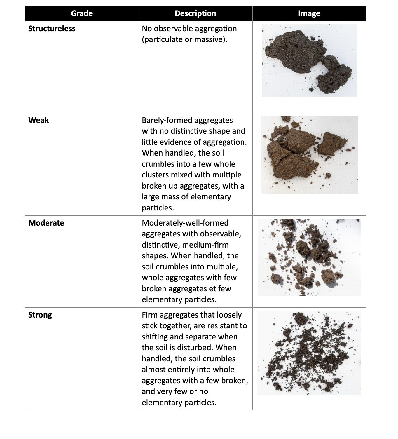 Degree of structure aggregation (development). The grade is determined by observing the proportion of aggregates and of (non-aggregate) soil particles after lightly squishing soil between one's fingers.