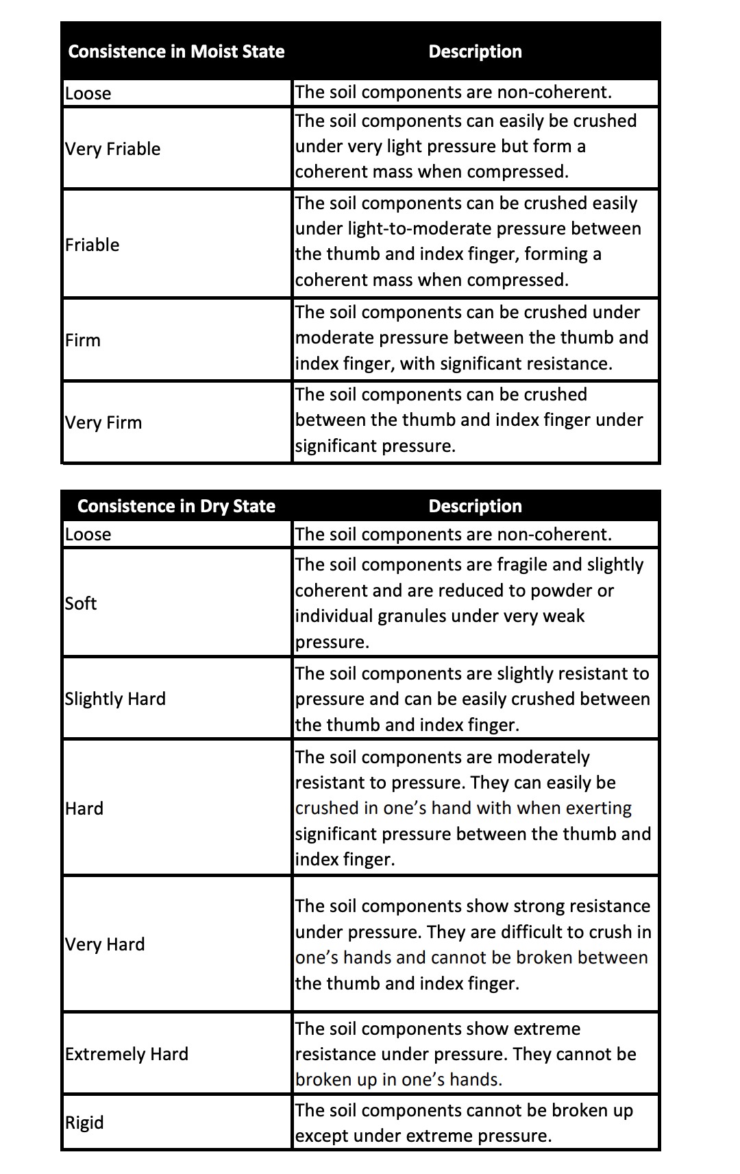 The aggregates' resistance to deformation. Consistence is evaluated by gently squeezing a sample between one's fingers. We therefore assess the aggregates' resistance to being crushed or deformed. The consistence class depends on the soil's moisture level..