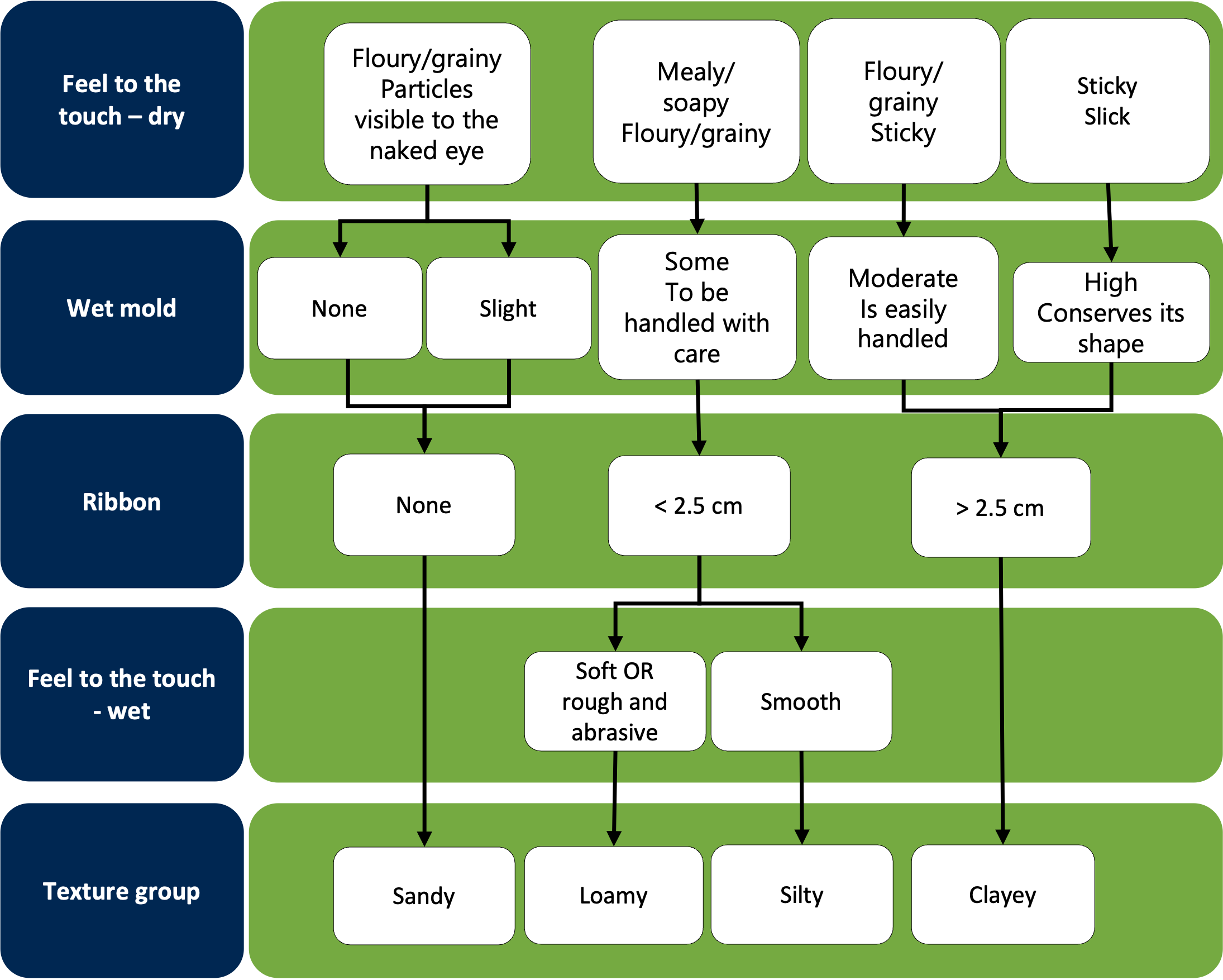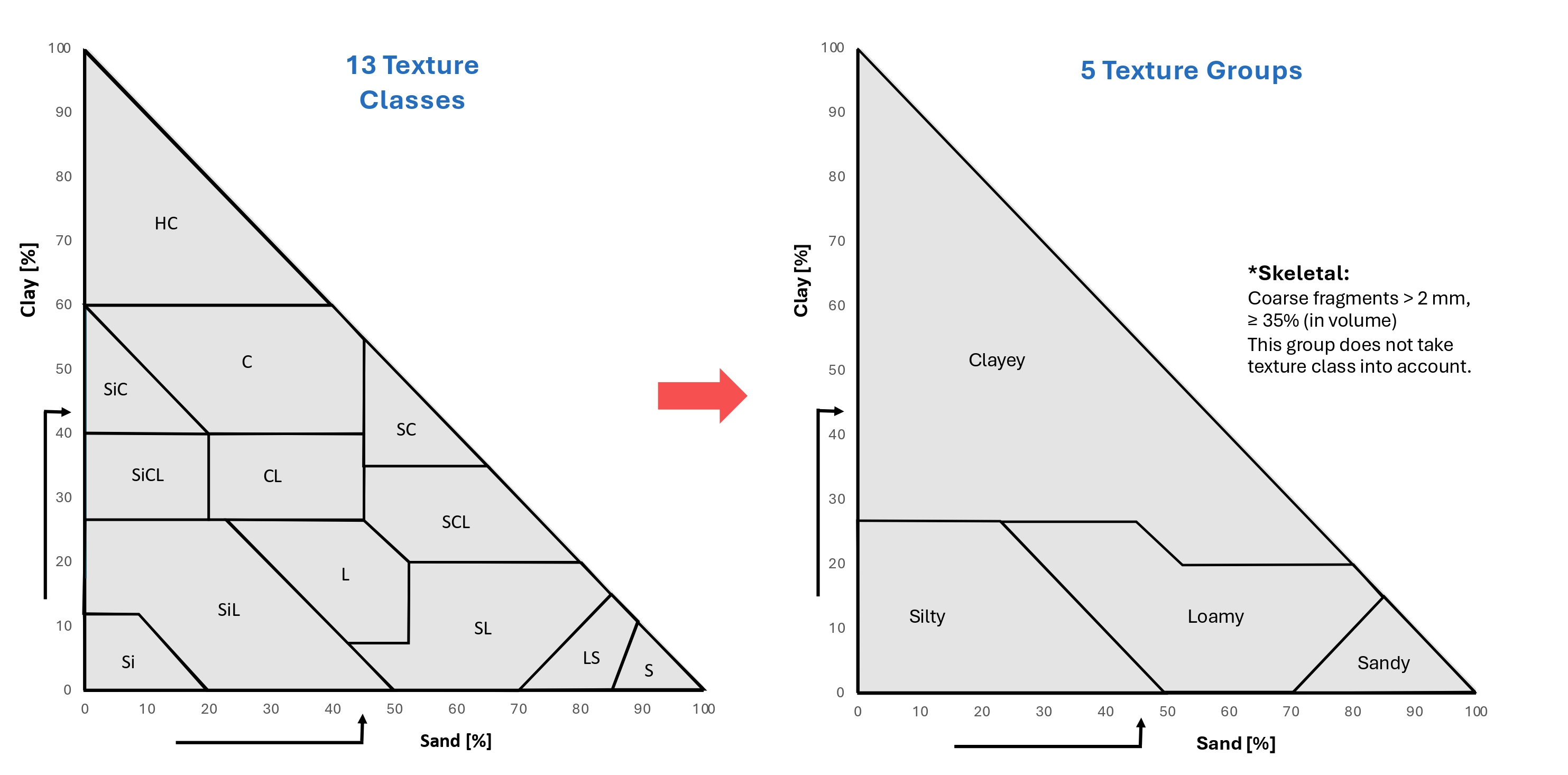 The texture group is manually estimated in the field using the following methodology. When identifying skeletal soils, however, we do not take texture group into consideration. Rather, we estimate the volume of fragments (> 2 mm) in the profile. We encounter a skeletal soil when the fragment content is equal or higher than 5% of the soil's volume. The figure below shows the grouping of 13 texture classes and five texture groups.