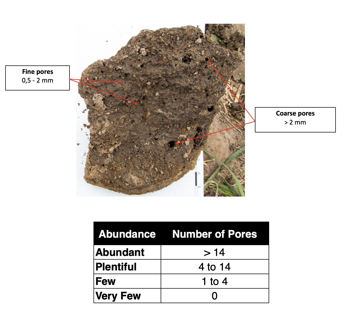 Assessment of the number of fine (0.5 to 2 mm) and coarse (>2 mm) pores visible to the naked eye on a 10 cm X 10 cm surface from an undisturbed sample.